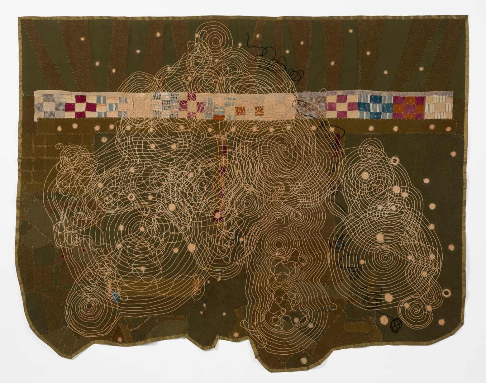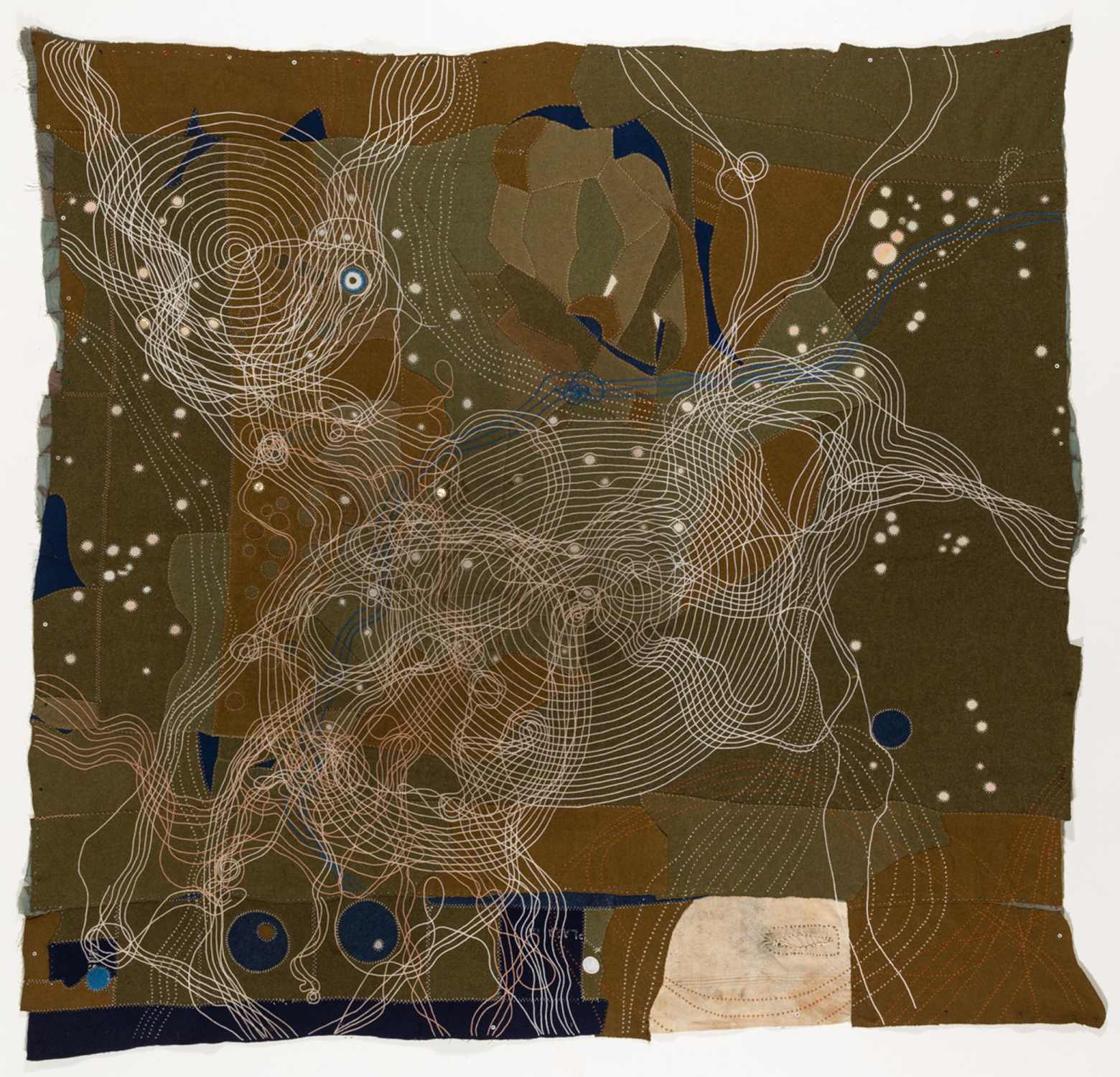 Jeanne Bieri started her artistic career as a painter, but she has become better known for her remarkable fiber works. The army blanket is a regular base layer to her pieces and carries a significant emotional charge. Bieri finds that the blankets always arrive with holes and her first task in one of mending. On top of that, she creates patterns of stitching that, at times, suggest both the cosmic and the terrestrial.