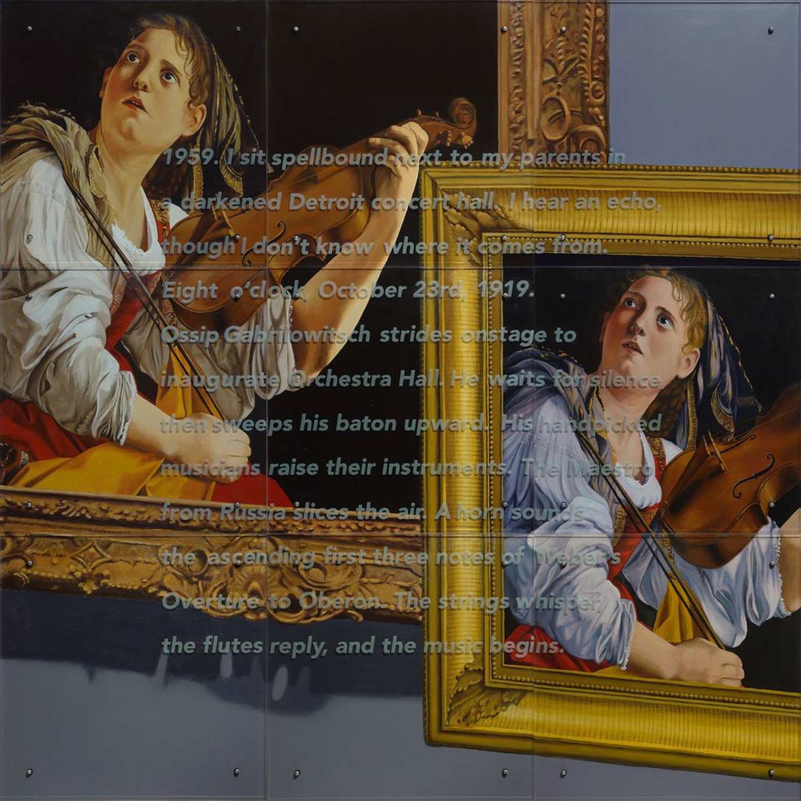 Measuring 96 inches by 96 inches across nine panels, “I hear an echo” is comprised of oil on wood panel, sandblasted glass, and bolts. Its source is the seventeenth century Italian painter Orazio Gentileschi’s Young Woman with a Violin (Saint Cecelia) (1612), which hangs at the DIA. Aptekar is known for bringing contemporary points of view to the history of art by combining paintings with text. The overlay text of “I hear an echo”reads: